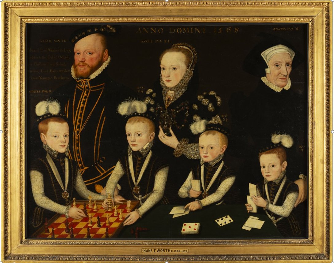 Figure 7. Portrait of the family of Edward Windsor, 3rd Baron Windsor, 1568. Bute Collection at Mount Stuart. Photo Keith Hunter. Edward Windsor (1532-1575), his wife Katherine de Vere (1543-1600), his four sons, Frederick, Henry, Edward jnr, Andrew, and an unidentified 61 year old woman. Painted by The Master of the Countess of Warwick (perhaps Arnold Derickson).